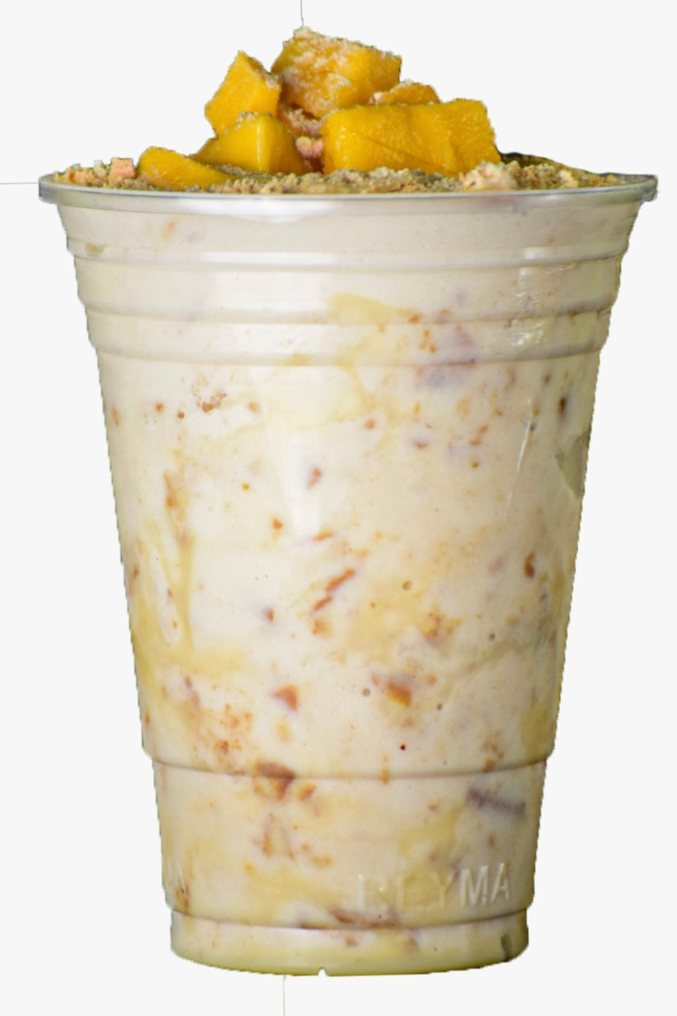 Helado de Pay de Limón acompañado de trozos de galleta María, lechera y decorado con mango natural.